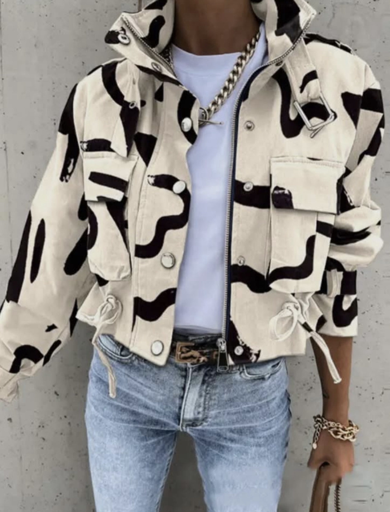 This statement jacket features a bold abstract line print that adds a modern touch to any outfit. Perfect for layering over casual or dressy looks.