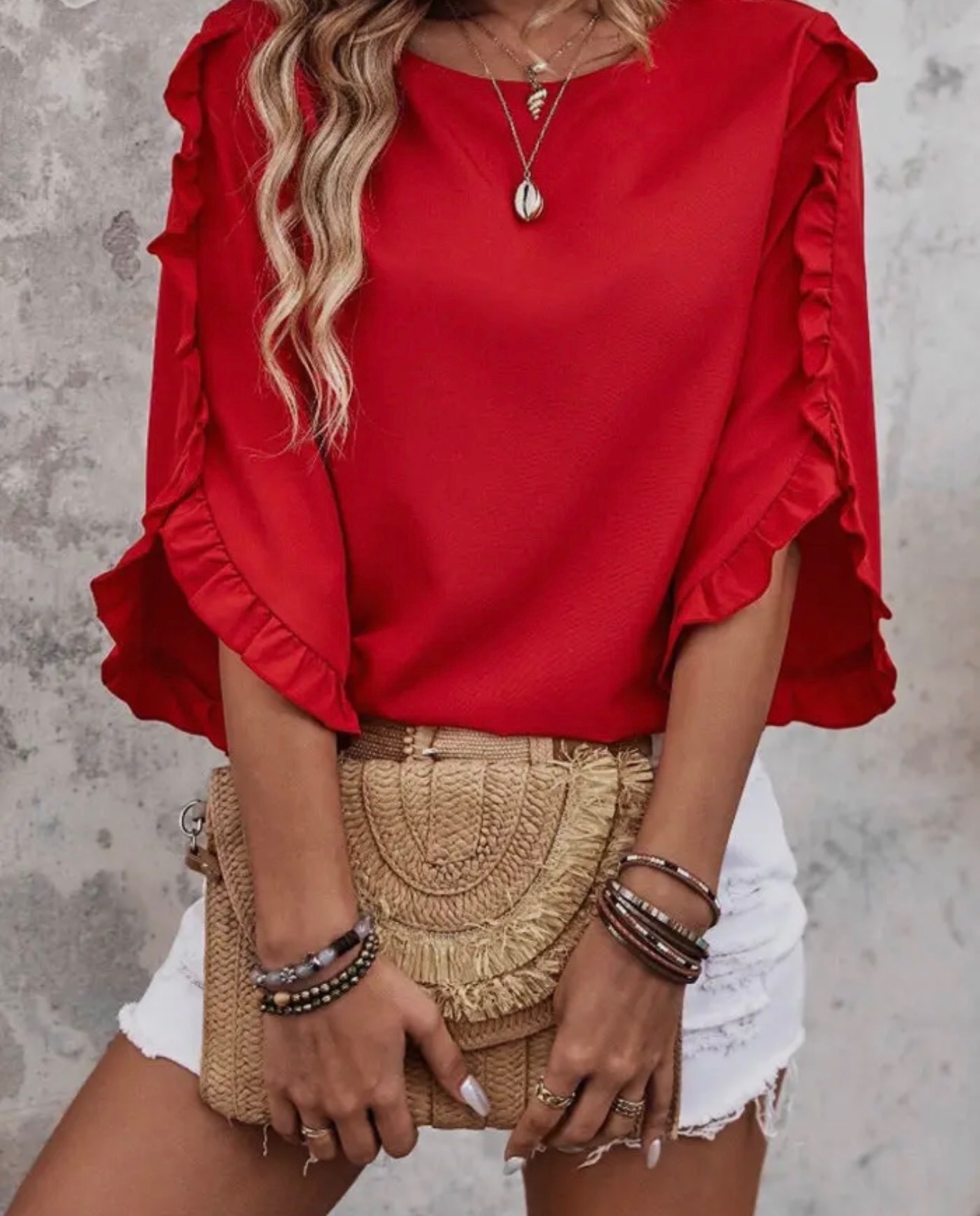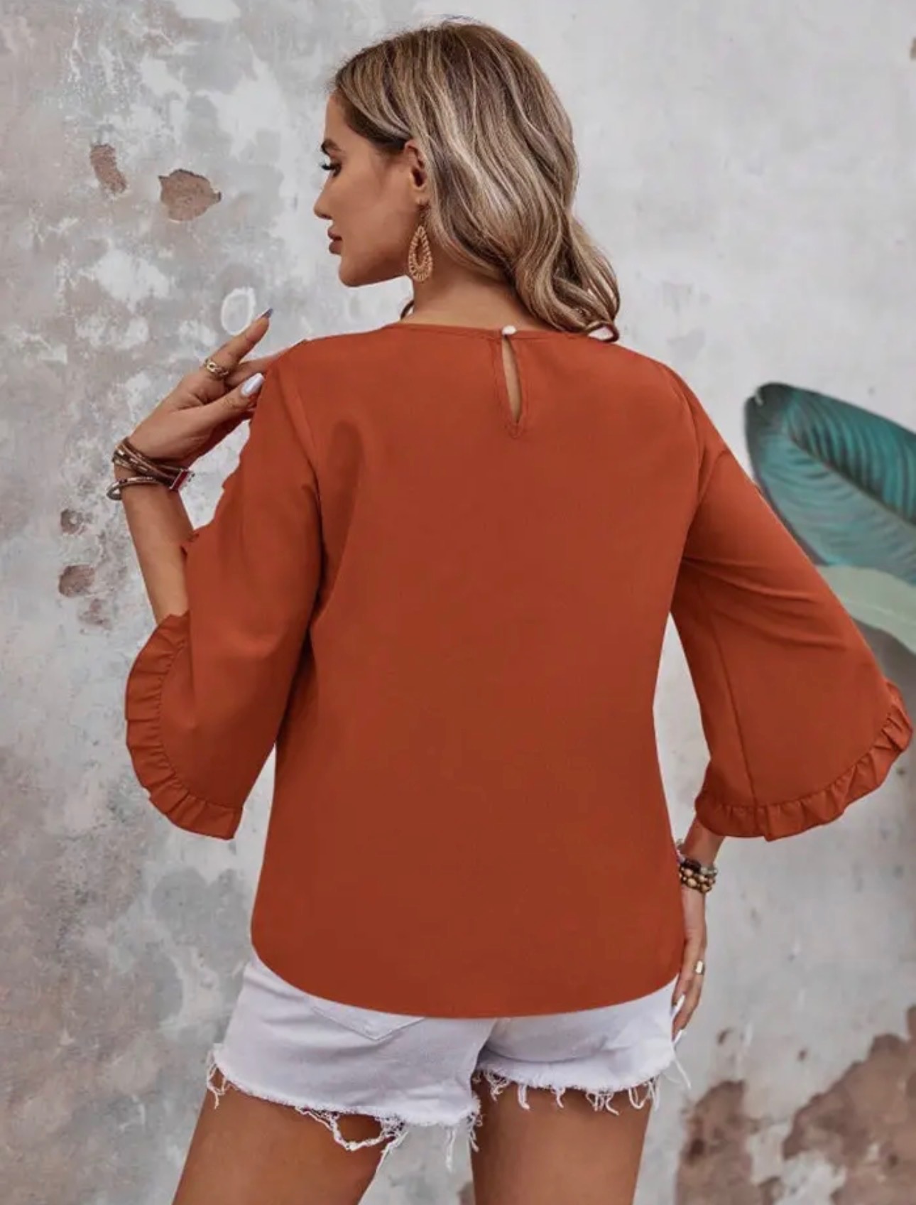 Vibrant blouse with soft ruffle sleeves that add just the right touch of drama. Lightweight, flattering, and perfect for dressing up denim or shorts.