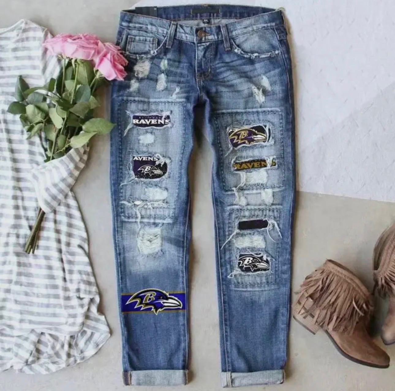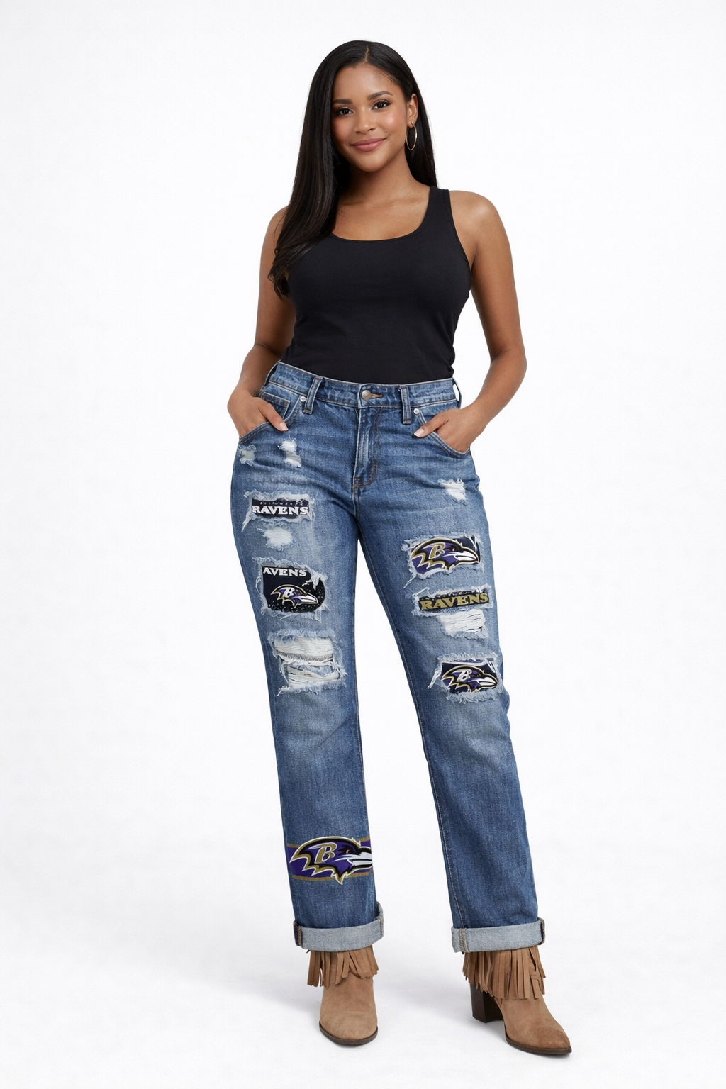 Distressed denim featuring authentic Baltimore Ravens patch detailing throughout. Designed with a classic mid-rise fit and cuffed hem, these jeans blend sporty pride with everyday street style—perfect for game days, tailgates, or repping the city anytime.